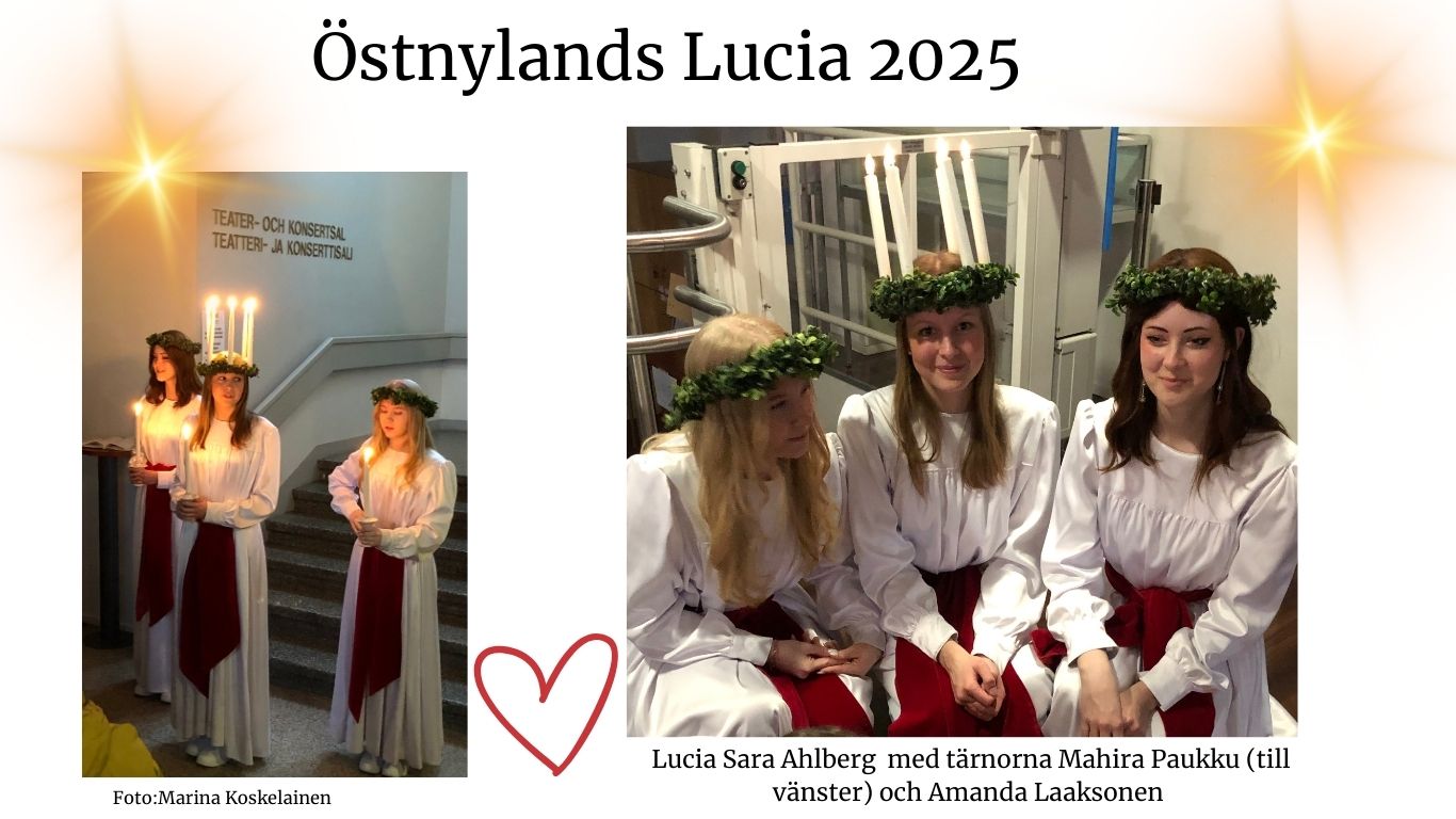 Som Östnylands Lucia kröntes Anna.Julia Stråhlmann samt som tärnor Ellen Söderberg och Jennie Hagman.